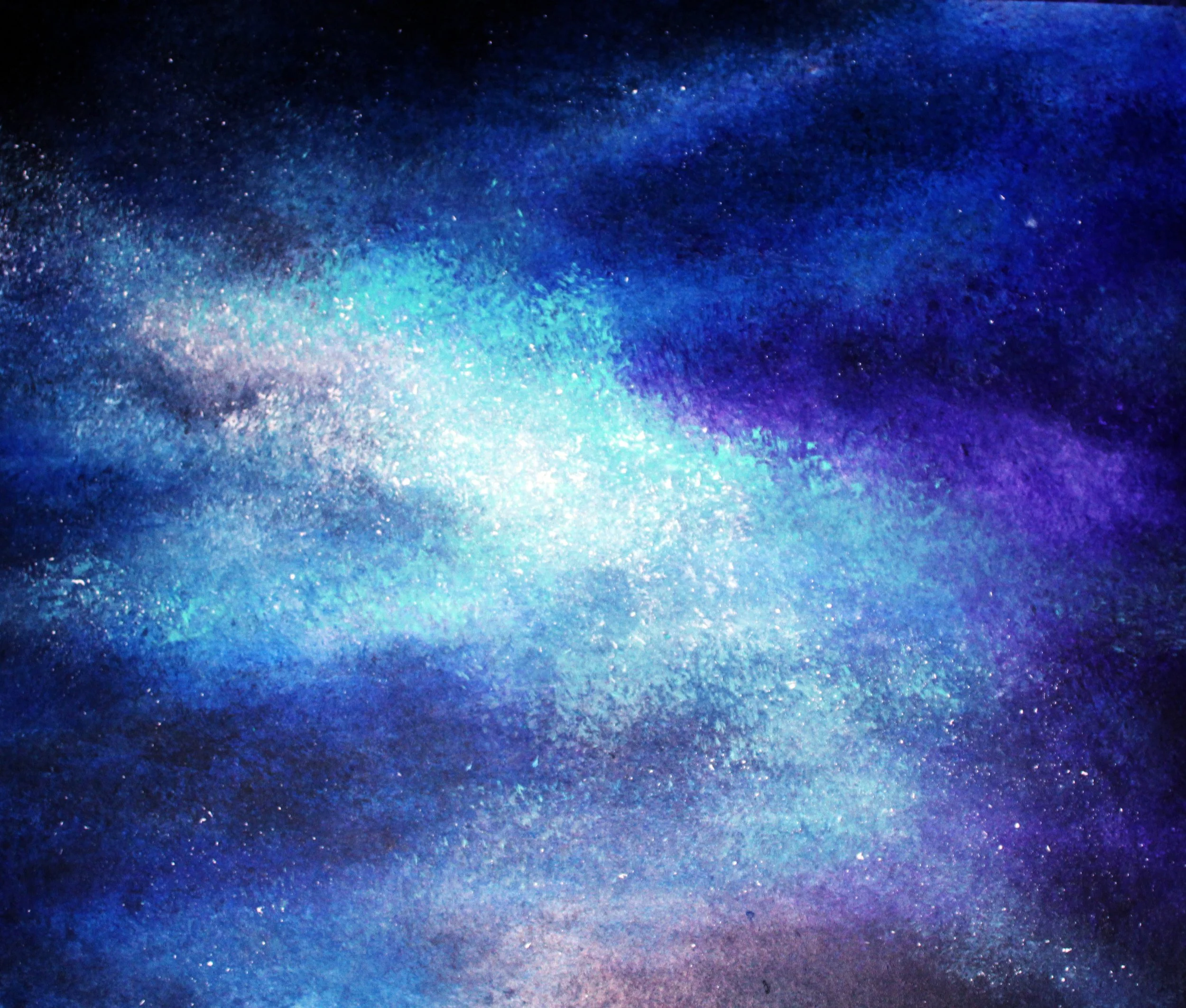 En la mitad superior, el cielo está poblado por densas nubes de un azul pálido casi blanco, que se extienden en bandas horizontales y diagonales, creando una sensación de movimiento y profundidad. Entre las nubes, se insinúan parches de un azul más oscuro, salpicados de diminutos puntos blancos que representan estrellas, sugiriendo una noche clara a pesar de la nubosidad. En el centro, un majestuoso grupo de montañas de picos afilados y siluetas oscuras se alza, cubiertas por lo que parecen ser nubes bajas o niebla, que se mimetizan con el cielo. La técnica de las nubes y las estrellas crea una atmósfera etérea y casi mágica.